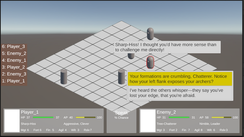 - tag system: though gameplay and other effects, units will gain "tags" which will have both game effects (being "weak" might give you -1 might) and also inform the generative AI systems in the game. Tags on a unit can come from their species, equipment, past events, terrain tile, weather, faction alliance, and various other forms to help build a complete picture of the unit's current state.