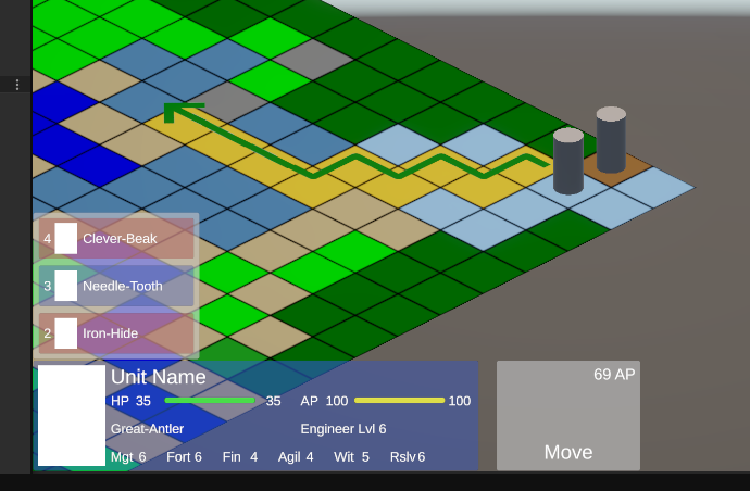 - I may also have to play around with hiding/showing certain tiles based on rotation / unit visibility. We don't want a situation where you can't see the current unit because they're surrounded by higher tiles on the map